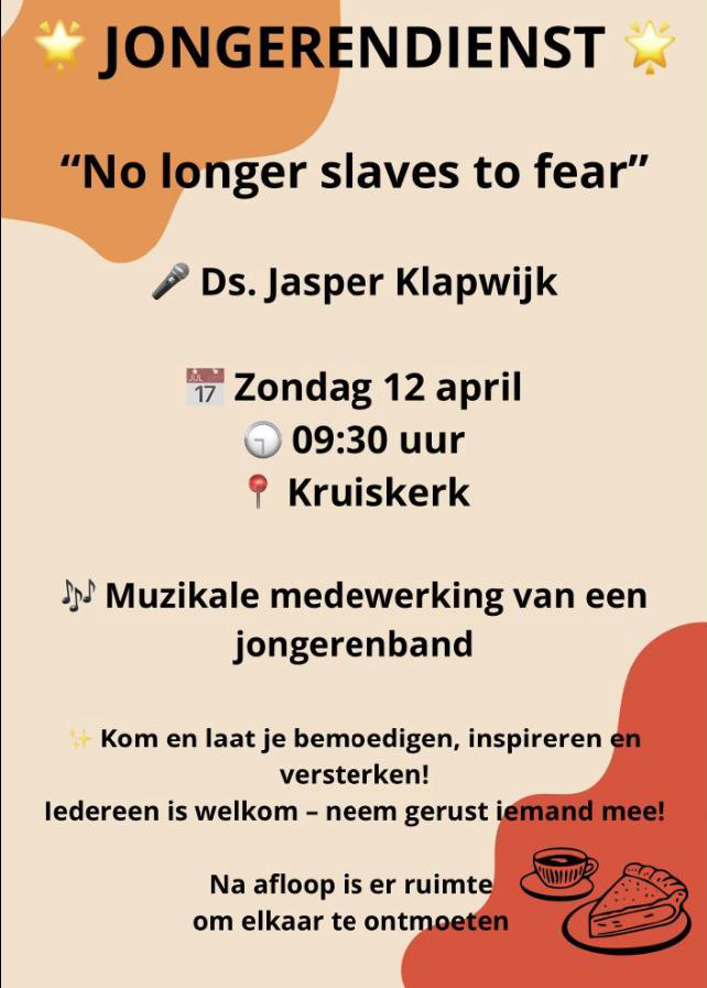 Deze zondagmorgen wordt er in de Kruiskerk een gezamenlijke jongerendienst gehouden. In deze dienst zal ds. Jasper Klapwijk voorgaan. Het thema is: “No longer slaves to fear”.